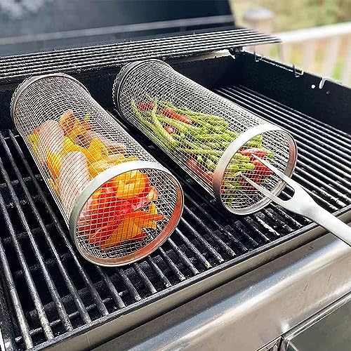 ComphyGo Grill Basket 2 PCS, BBQ Grill Basket, Rolling Grilling Basket, Stainless Steel Grill Mesh BBQ Grill Accessories, Portable Grill Baskets for Outdoor Grill for Fish,Meat, Vegetables, Fries